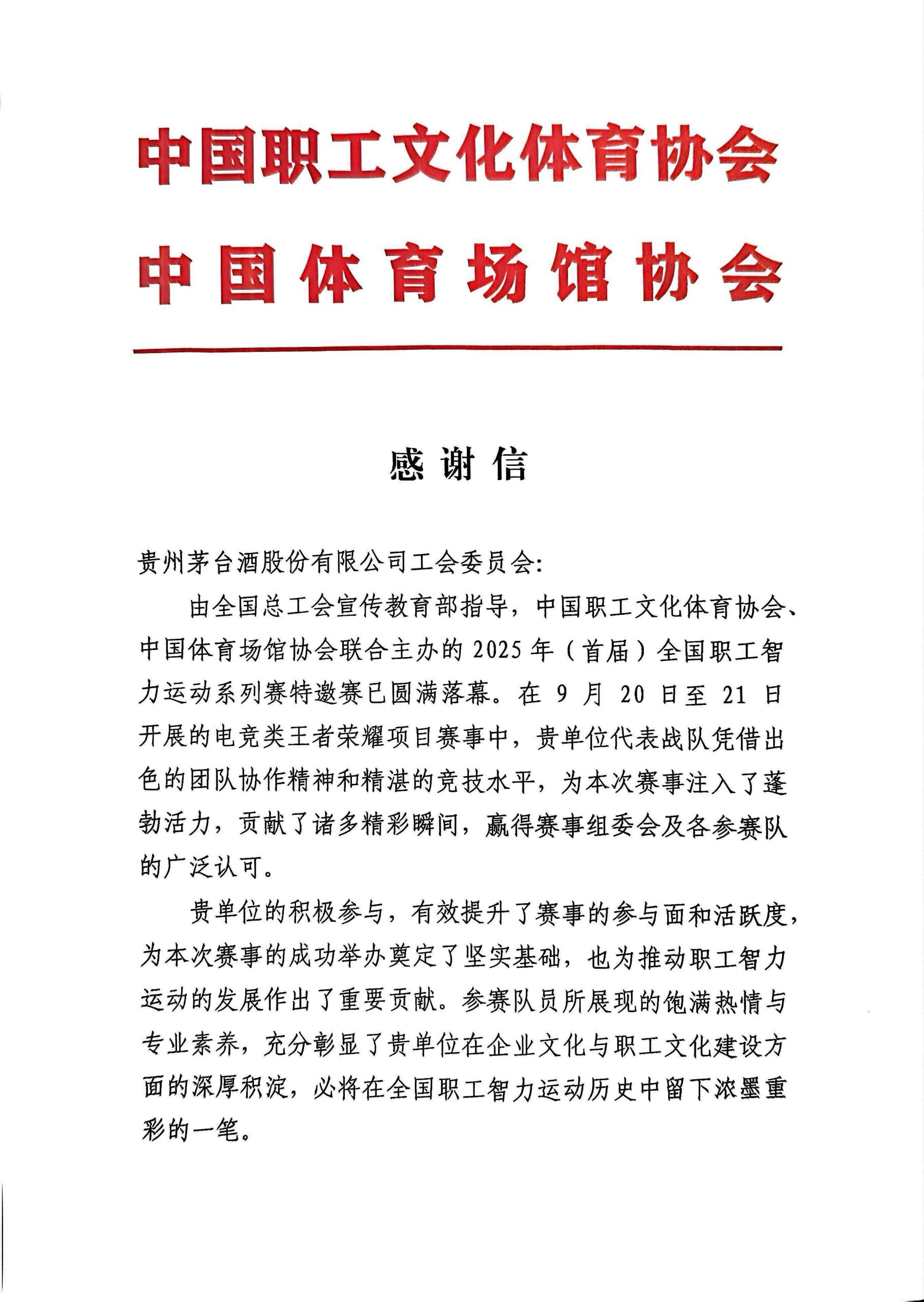 在9月20日至21日开展的(首届)全国职工智力运动系列赛-电竞类王者荣耀项目赛事中,贵州茅台酒股份有限公司代表队凭借出色的团队协作精神和精湛的竞技水平,为 本次邀请赛注入了蓬勃活力,贡献了诸多精彩瞬间,获得了中国职工文化体育协会、中国体育场馆协会的肯定,也赢得了赛事组委会及各参赛队的广泛认可。